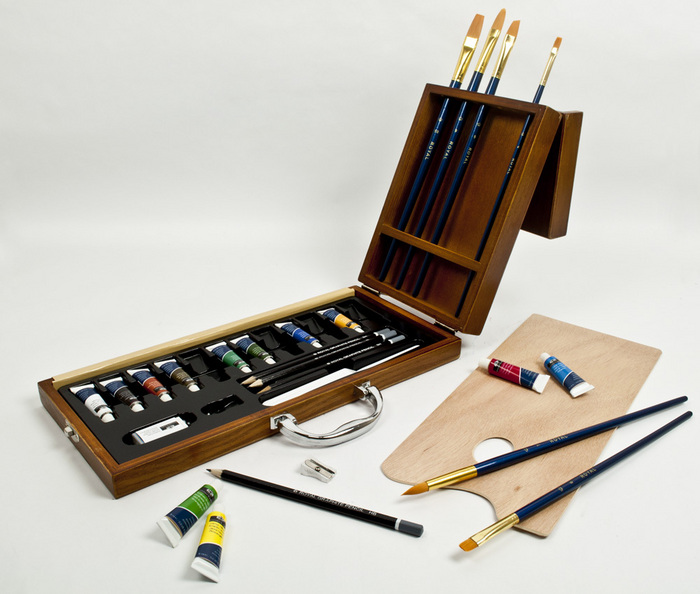 Prémiové sady od značky Royal & Langnickel sú podávané do odolných drevených boxoch. Box je dodávaný s ručne vyrábanými umeleckými materiálmi vysokej kvality, štetcami a nástrojmi, ako aj sprievodcom pri maľovaní s tipmi a technikami.