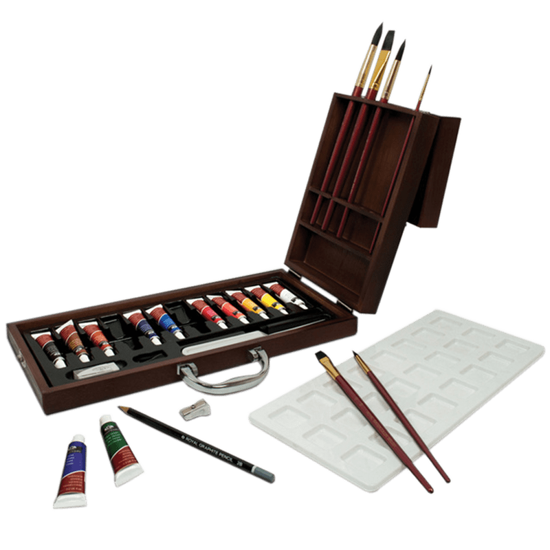 Premium setovi marke Royal & Langnickel dolaze u trajnim drvenim koferčićima. Koferčić dolazi s ručno izrađenim umjetničkim materijalima visoke kvalitete, kistovima i alatom, kao i vodičem za slikanje s vrstama i tehnikama.