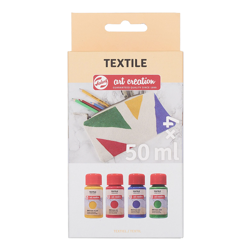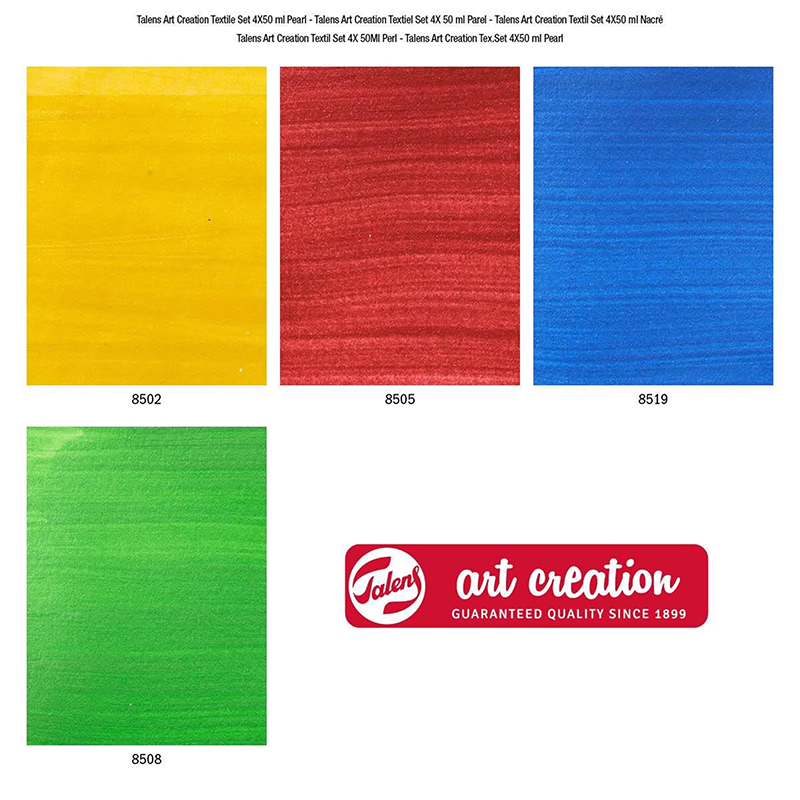 Oplemenite odjeću, dodatke ili unutarnje ukrase poput navlaka za jastuke, zavjesa i drugih tekstilnih predmeta Talens Art Creation bojom za tkanine! Ovaj komplet sadrži 4 svjetlucave biserne nijanse boje za svijetle tkanine (minimalno 50% pamuk). Uživajte u stvaranju vlastitih uzoraka na tkanini! Sadržaj: Sadrži 4 x 50 ml (8502 Biserno žuta - 8505 Biserno crvena - 8519 Biserno plava - 8508 Biserno zelena).