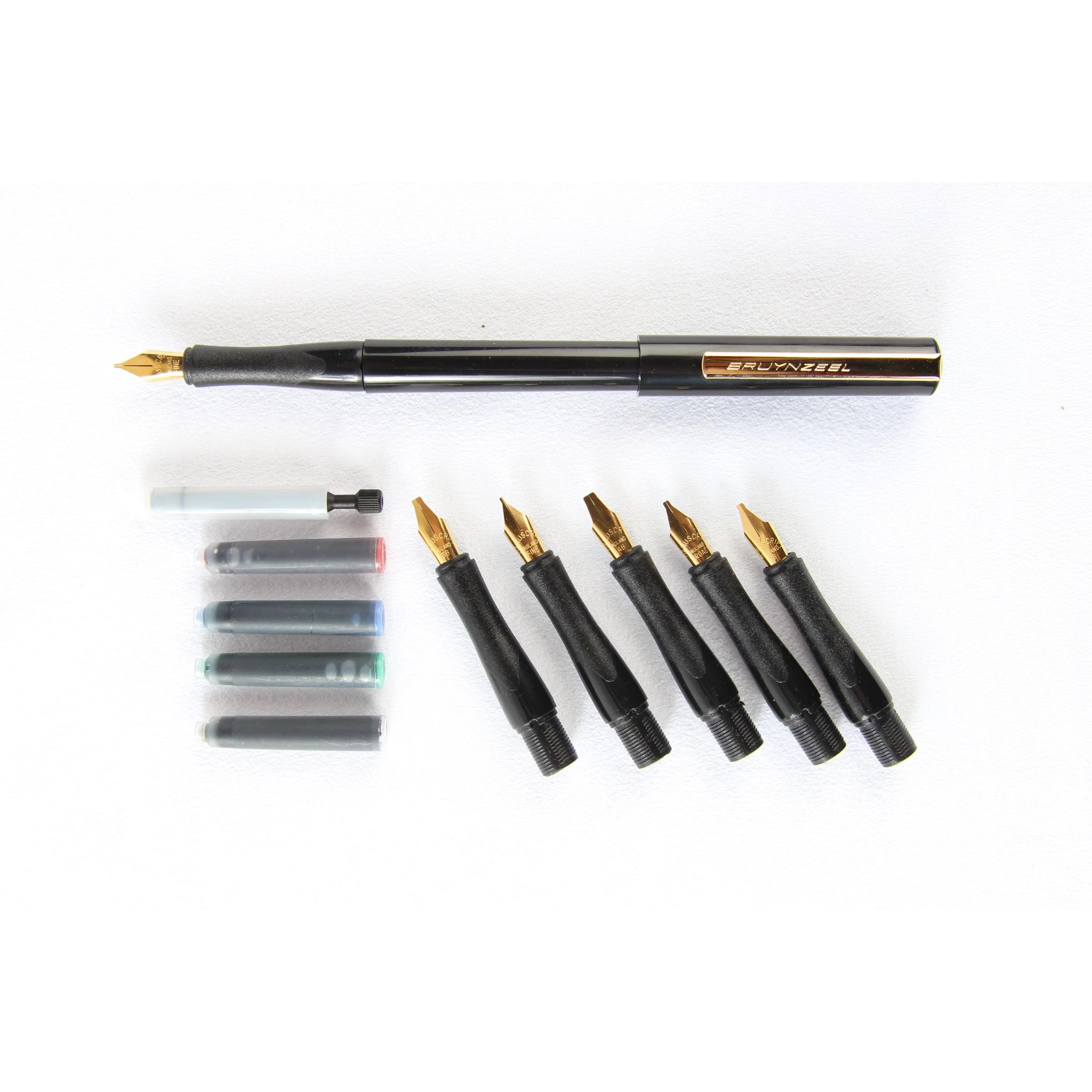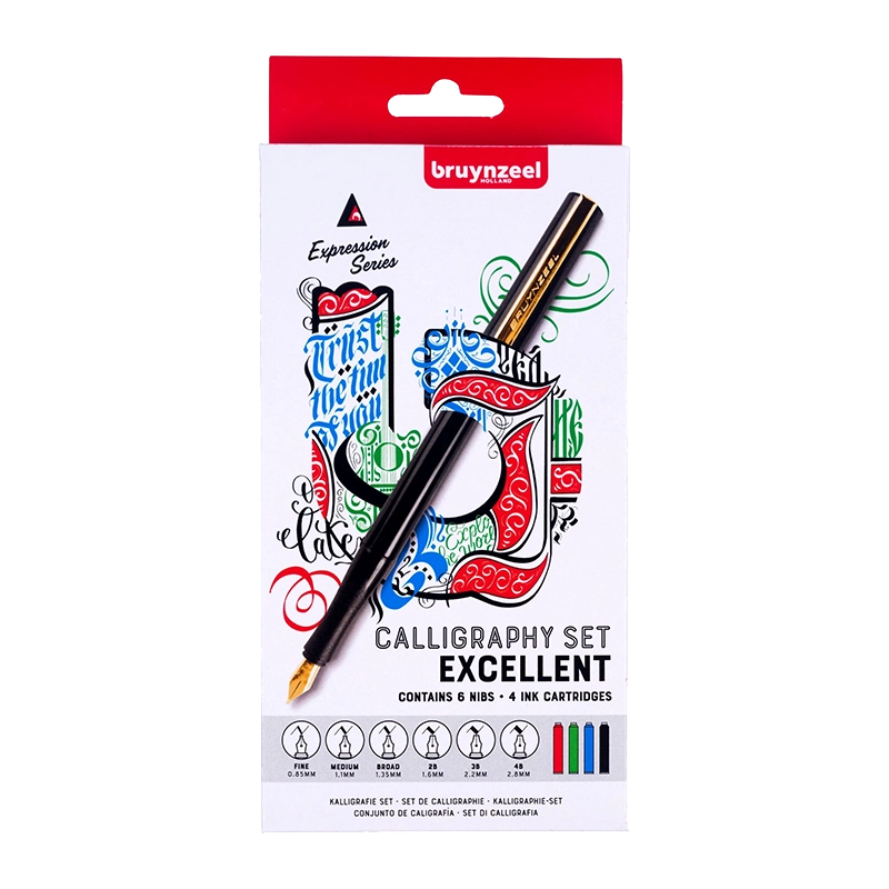 Kompletan luksuzni set za kaligrafiju. Sadrži šest različitih mjedenih vrhova (fini, srednji, široki, 2B, 3B i 4B), pretvarač, 4 posudica s tintom u boji i 4 glavice. Sadrži upute sa savjetima i trikovima.