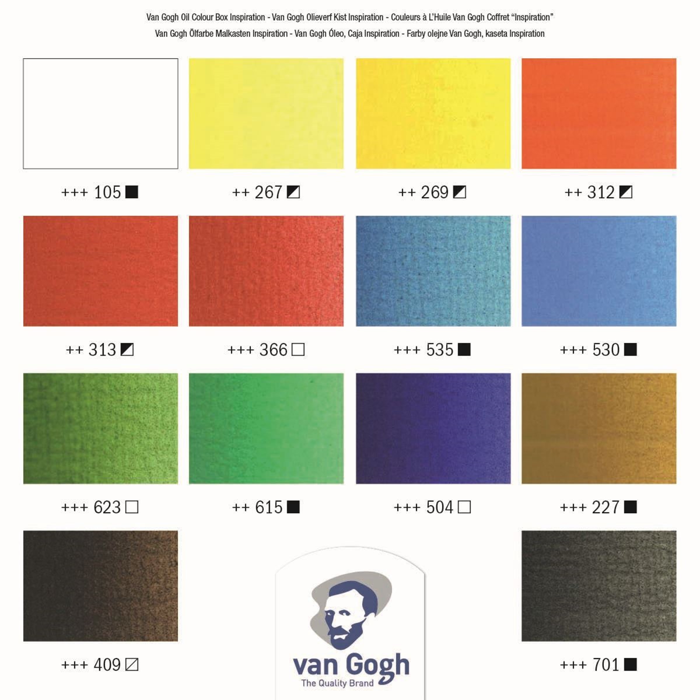 Ovaj set okvira za inspiraciju za općeniti odabir boja uključuje epruvete od 14x40 ml u sljedećim bojama: Titanium White (105), Azo Yellow Lemon (267), Azo Yellow Medium (269), Azo Red Light (312), Azo Red Deep (313), Quinacridone Ruža (366), Cerulean Blue Phthalo (535), Sevres Plava (530), Sap Green (623), Emerald Green (615), Ultramarine (504), Žuti Oker (227), Burnt Amber (409), Ivory Black ( 701). Ovaj set drvene kutije također uključuje: Talens 75ml white spirit bez mirisa, Talens 75ml medij za slikanje, pljosnati kist za crtanje sa svinjskim čekinjama (veličina 10), okrugli kist za crtanje sa svinjskim čekinjama (veličina 6), slikarski nož, dupla posuda za palete, drvena paleta, krpa za čišćenje i brošura za miješanje boja.